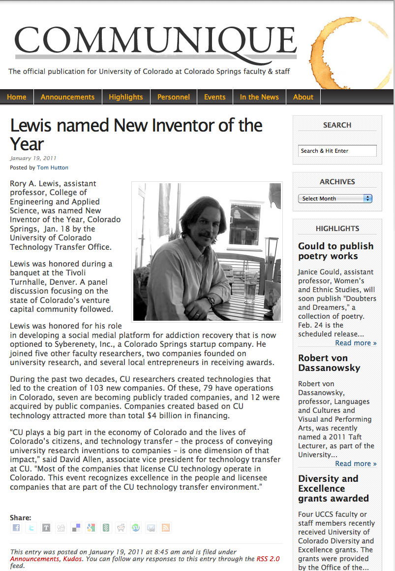 Dr. Lewis received Inventor of the Year for his work in machine learning and artificial intelligence. Drs Boult and Lewis tested various algorithms to optimize a means for a machine to predict when an addict would relapse. Training and testing was performed wherein the patients were tested by having them play simple games such as reating numbers shown on the screen. Additionally, the artificial intelligence was coded to discern from analyzing patient's behavior on thier smart phone, walking, GPS whether the patient was sober, sober but about to relapse or post relapsing. When the AI believed the patient was about to relapse it would alert the patient's predefined intervention personnel.