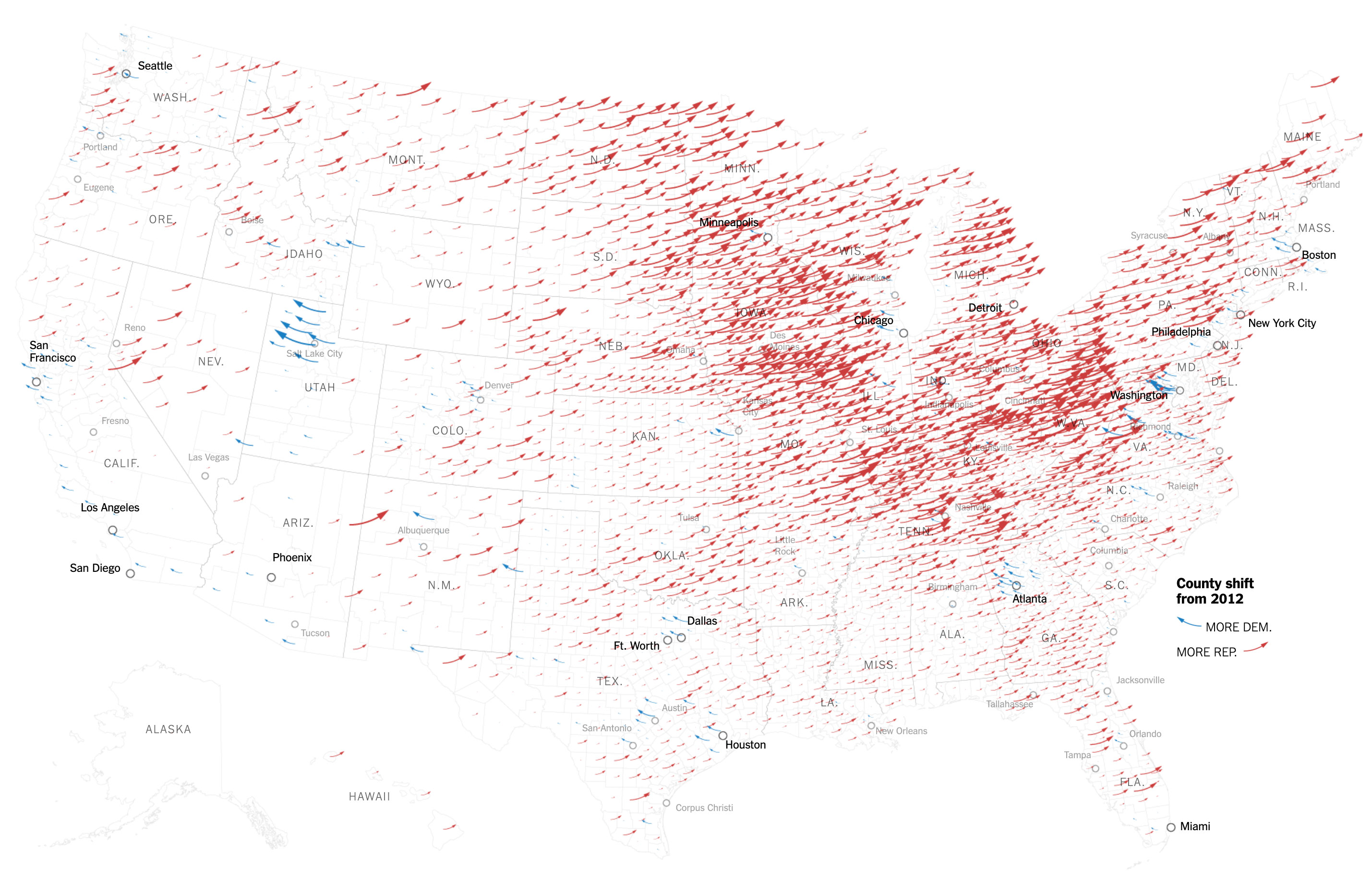 Bostok's amazing bigdata and very cool D3 award winning visualization. Specifically made to interact with artificial intelligence and graphics. This image shows the county shifts from 2012. See full article in the New York Times here.