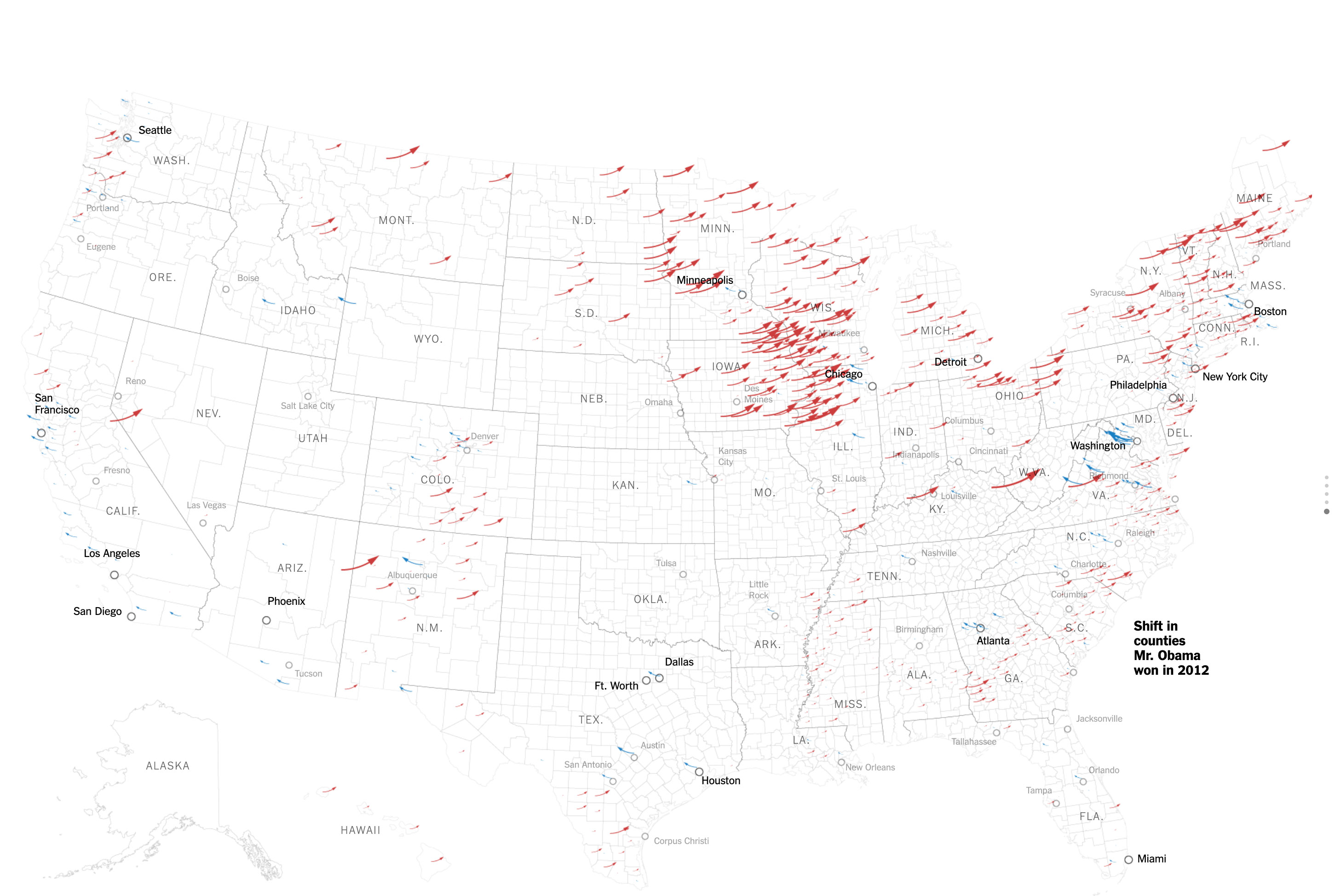 Bostok's amazing bigdata and very cool D3 award winning visualization. Specifically made to interact with artificial intelligence and graphics. This image shows the shift ijn counties Obama won in 2012.See full article in the New York Times here.