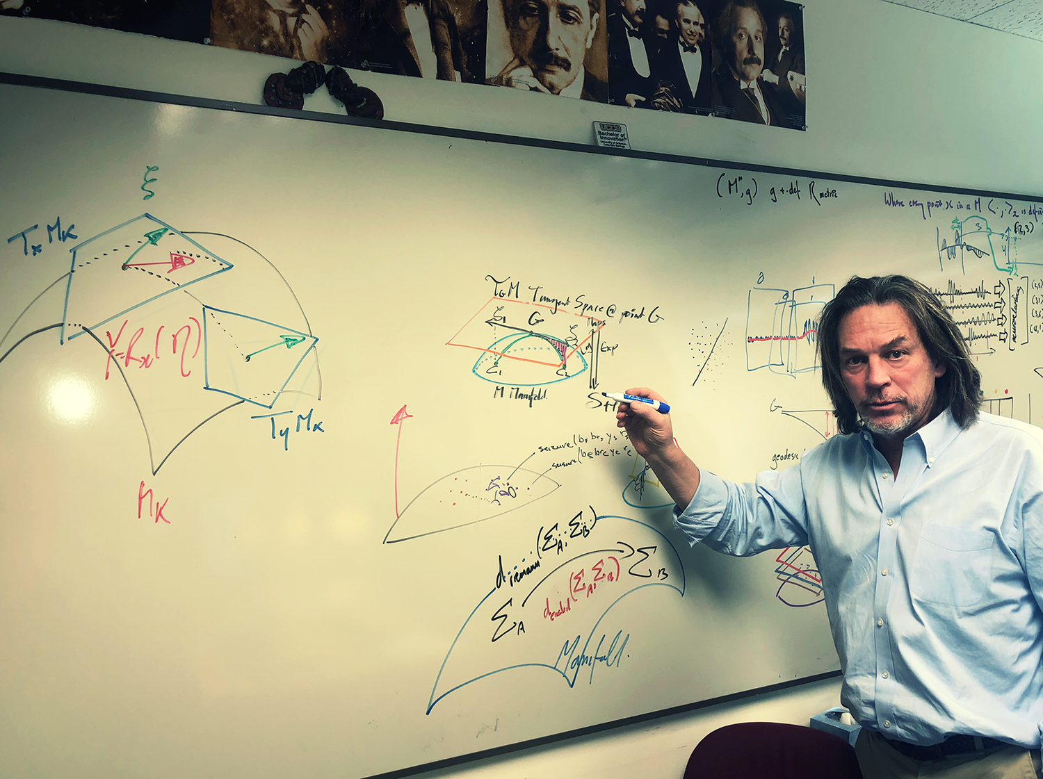 Not that I am trying to draw in more than 3-Dimenions. But our hypothesis is that a manifold with n-dimenions with clustering could procure a machine learning system to learn different dimenions differently and thus become smart. Photo taken by Eli Brainard UCCS, Feb 6th, 2019. In general, one will find that Riemann distance is better for defining positive semidefinite matrices such as covariance matrices where one wants manifold to be able to retain n-dimenions, than Euclidian distance. To view equations, see larger version of photo here.